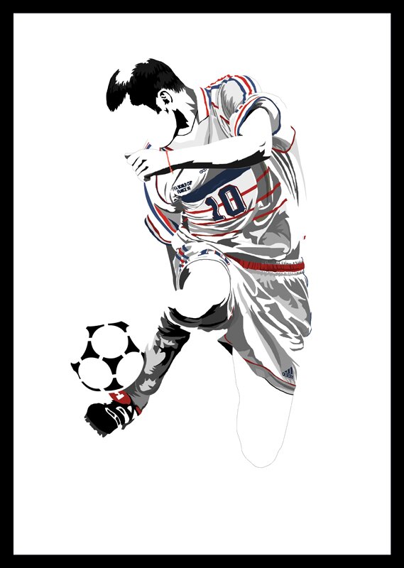 This is a piece I’ve been working on recently for next years Fantasista Exhibition, which will be launching in Spring 2013 at a Central London location. The exhibition will celebrate players who (in the organisers own words) “are a symbol of creativity and invention, of imagination and entertainment, of artistry and magic”. So I thought who better to take on than “Zizou”.